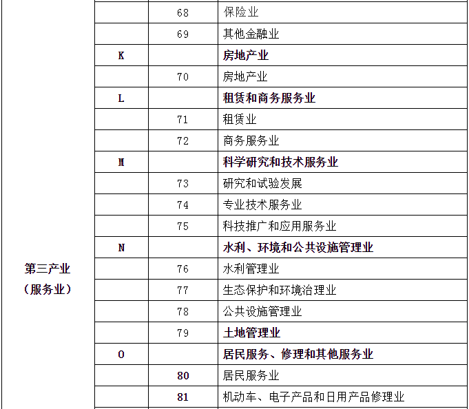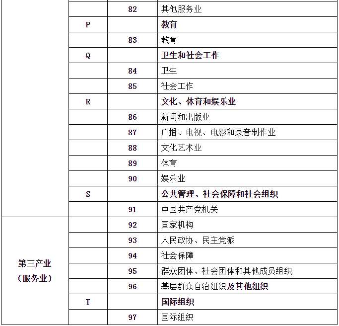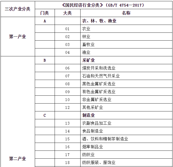 劳动者,不管是脑力劳动还是体力劳动,都会归属一个行业。关于国民经济行业的划分,GB/T 4754-2017有规定,包括分类和代码表,具体分为20门类(A~T)、97大类、473中类、1381小类,非常详尽。以此为基础,国家统计局又进行了“合并同类项”,发布《三次产业划分规定》,也就是通常所讲的第一、第二、第三产业。对应2017版的GB/T 4754,2018年发布最新的三次产业划分表如下: