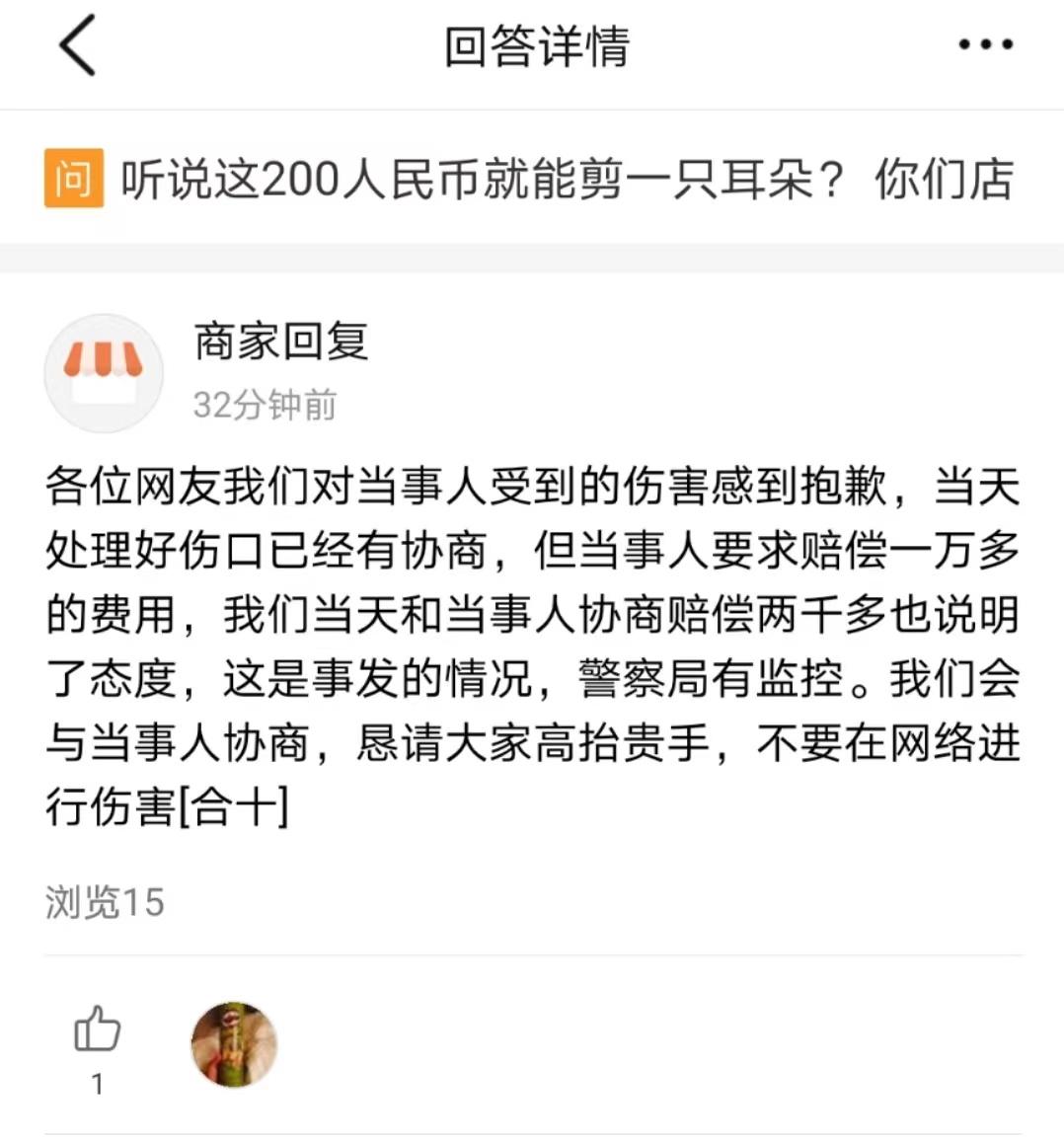 有网友在涉事门店评论区留言询问此事,门店于1月19日晚7点左右在美团评论区发表回应称:我们对当事人受到的伤害感到抱歉,当天处理好伤口已经有协商,但当事人要求赔偿一万多的费用,我们当天和当事人协商赔偿两千多也说明了态度。